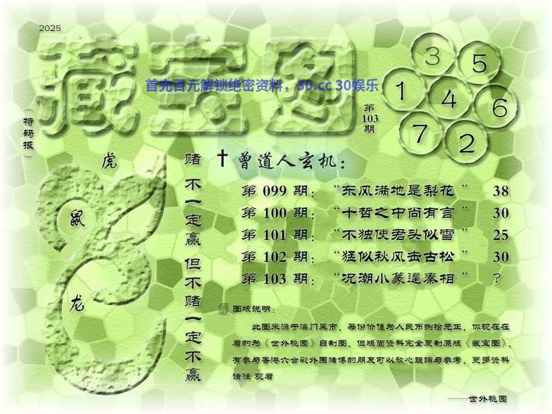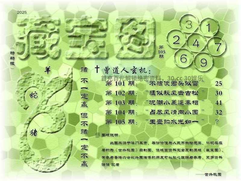 106期藏寶圖新:陌上最怜芳草色 老:为问只今江海上 禁:狗 禁:2尾 玄機字:《纬》