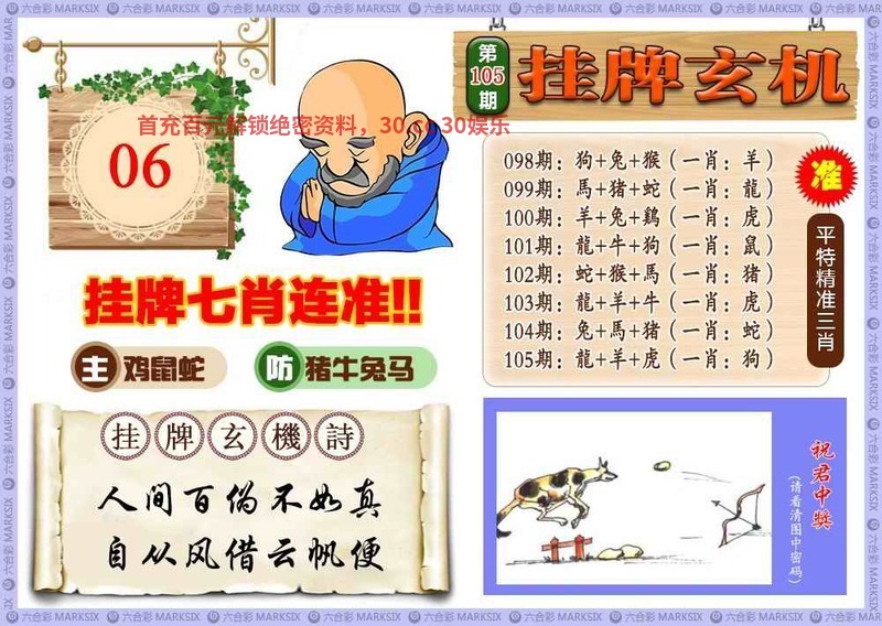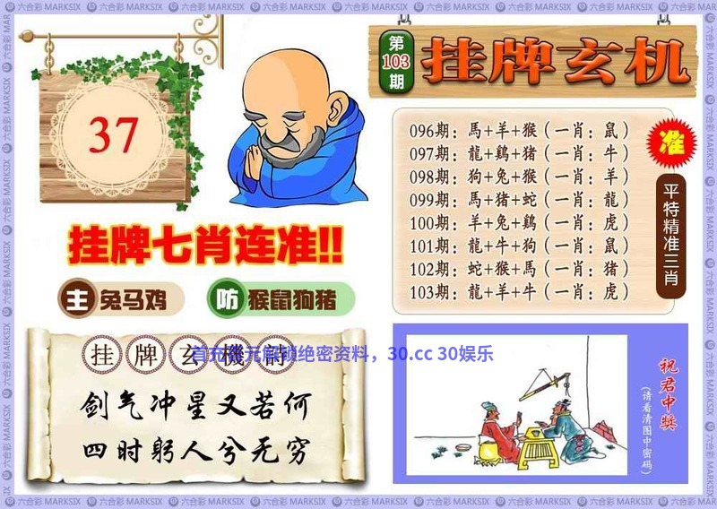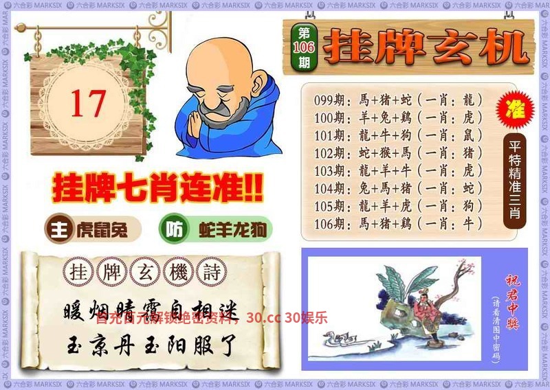 106期挂历诗:三哥今期可发财,三一四三可相连。