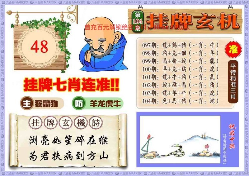 106期无字天书:一九加三得二特,七与五争三得利。蛇09